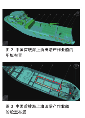 中國首艘海上油田增產作業船如 圖 1 所示,總長 81.15m,垂線間長 70.80m,型寬 18.00m,型深 7.40m, 最大吃水 5.8m。船上配有燃油艙 560m 3 ,壓裂泵柴油艙 36.9m 3 ,淡 水艙 360m 3 ,膠液艙 710m 3 ,可存 儲 PH 值為 1~13 范圍內的酸堿液體。 增產作業船的甲板區面積 645m 2 , 甲板均布負荷 5t/m 2 ;甲板上有兩 臺吊車,可全部覆蓋上甲板區域; 甲板上還有 15m 2 恒溫增產配件材料 房。該船總功率 6,000KW,總噸位 3,300t,最大載重量 2,810t,設計 航速 14.0 節,可續航 6,000 海里。 該船主要進行海上壓裂酸化作 業,其甲板布置如圖 2 所示。圖 2 中 1 為 船 控 室 及 數 采 房, 配 備 有 ES-22ACD 型 號 的 數 采 房 1 套。