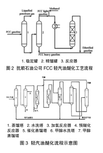 2002 年, 中 石 油 西 南 油氣田分公司南充煉油化工總廠引 進(jìn) 此 技 術(shù) 建 成 了 0.16Mt/a 的 FCC 汽 油 醚 化 裝 置。 該裝置醚化后的汽油烯烴含量降低 10~15 個(gè)百分點(diǎn),質(zhì)量分?jǐn)?shù)達(dá)到 31%~32%,辛烷值可提高 1~3 個(gè) 單 位。2008 年 中 石油西北某煉油廠也引進(jìn)此技術(shù)建 成 一 套 15 萬(wàn) t/aFCC 汽 油醚化單元,2013 年中石油烏魯木 齊 公 司 全 套 引 進(jìn) CDTECH公司加氫催化蒸餾、醚化和異構(gòu)化技術(shù),建成一套 40 萬(wàn) t/a 輕汽油醚化裝置,投產(chǎn)后汽油品質(zhì)及產(chǎn)品結(jié)構(gòu)獲得大幅改善。其裝置的異構(gòu)化轉(zhuǎn)化率為56.30~70.57%。2013 年,中化泉州石化也引進(jìn)催化蒸餾技術(shù)建成催化裂化輕汽油醚化裝置。工業(yè)應(yīng)用結(jié)果表明,異戊烯的總轉(zhuǎn)化率高達(dá) 96.52%,醚化汽油與抽余油混合后的辛烷值、氧質(zhì)量分?jǐn)?shù) 分 別 為 96.44% 和 3.16%。中石油撫順石化公司在 20 世紀(jì) 80 年代初,與撫順石油學(xué)院合作對(duì) FCC 輕汽油醚化工藝進(jìn)行了系統(tǒng)研究,1994 年建立了國(guó)內(nèi)第一套 FCC 輕汽油醚化工業(yè)化裝置,處理量為 250kt/a。該裝置工藝流程如圖 2。該裝置以初餾點(diǎn)約為 75℃的輕汽油為原料,采用 S54 大孔強(qiáng)酸型陽(yáng)離子交換樹(shù)脂為催化劑進(jìn)行醚化反應(yīng),醚化后 FCC 汽油烯烴含量降低,辛烷值可提高2~3 個(gè)單位,但限于工藝技術(shù)狀況及受催化劑等多種因素的影響,該裝置未能實(shí)現(xiàn)長(zhǎng)期穩(wěn)定生產(chǎn)。2000 年 5 月, 撫 順 石 化采用撫順石油學(xué)院開(kāi)發(fā)研制的FCC 輕汽油臨氫醚化工藝與催化劑,在自主開(kāi)發(fā)的中試醚化裝置上進(jìn)行了 4,000h 以上的催化劑壽命試驗(yàn),取得較好的效果,于 2002 年 4 月通過(guò)了中石油公司的技術(shù)鑒定。該技術(shù)工藝的主要特點(diǎn)是臨氫醚化反應(yīng)器內(nèi)進(jìn)行二烯烴選擇加氫和臨氫條件下的醚化反應(yīng)。醚化后的輕汽油的烯烴含量降低 9.6個(gè)百分點(diǎn),汽油的辛烷值提高 1個(gè)單位。