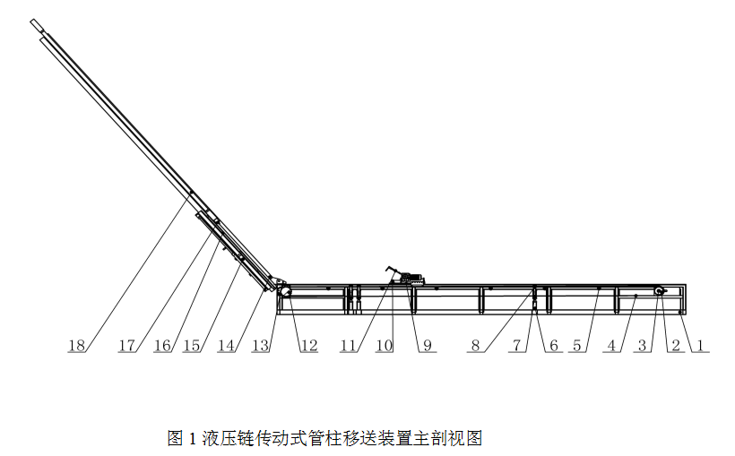 裝置以液壓作為動力,采用鏈傳動方式,通過低壓電遙控操作控制,實現鉆井施工中從場地到鉆臺或從鉆臺到場地鉆柱的移送,一次可以移送三根管柱。