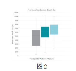 在數(shù)據(jù)集中分離出鉆離套管鞋的首次鉆井情況,并創(chuàng)建了一個風(fēng)險曲線圖,該圖描述了鉆頭能夠鉆抵給定距離的統(tǒng)計概率。結(jié)果表明,該公司的新型鉆頭有80%的機(jī)會鉆到5150英尺的測量深度,而競爭對手的鉆頭只有50%的機(jī)會鉆抵這一深度。相同過濾數(shù)據(jù)的方框圖和觸須圖表明,新型鉆頭的下四分位運行將是幾乎任何其它類型鉆頭的上四分位運行,也就是說,該公司這種新型鉆頭的鉆井性能下限已達(dá)到了其它類型鉆頭性能的上限水平。