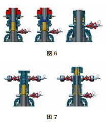 最后,兩個連接件在反扣RT連接處被拆開,然后放回管架。套管柱接近井底時,著陸接頭回連到套管懸掛器,落在主井口的殼體內(nèi)。計劃有足夠大的大鼠洞,使7-in.套管能安全放置。一旦套管懸掛器安裝工具被回收后,下一步就是設(shè)置11-in.套管懸掛器的封裝,見圖 6中(套管懸掛器封裝設(shè)置)。采用與緊湊型井口設(shè)備類似的程序,包括清洗封裝設(shè)定區(qū)域和設(shè)置封裝,使用5-in.厚壁鉆桿上的專用安裝工具。作為應(yīng)急,如果7-in.套管未能到達預(yù)期的設(shè)定深度,那么在固井候凝之后,利用一個滑動式套管懸掛器,RTO3井口能提供設(shè)定套管的替代方案,見圖6右(滑動式套管懸掛器應(yīng)急裝置)。下一步就是安裝油管頭四通 ,采用一個 7 1/16-in.5k級額定壓力的頂部法蘭連接。油管頭四通坐在11-in.的主井口殼體內(nèi),通過上緊法蘭螺母固定到位,圖7左(安裝油管頭四通)。
