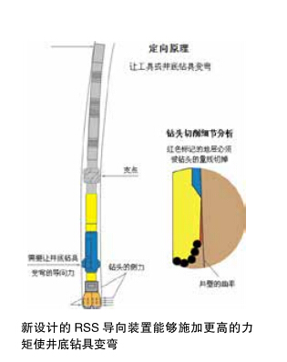 頁巖鉆井的興起將旋轉導向系統帶入一個更高水平的開發階段,在保持現有租賃價格的前提下,還要鉆出最長的斜深,作為回應這種需求,一種新的造斜率在 15° / 30m 的旋轉導向系統RSS 被研發成功。在一些井的鉆井作業中,新開發的 RSS 系統可一次下井鉆完垂直段、造斜段和水平段。新旋轉導向系統(RSS)對筒體進行了改進,使其井壁接觸面更長,其更短的三點幾何形體設計,能打出更短半徑或更高曲率的造斜井段。