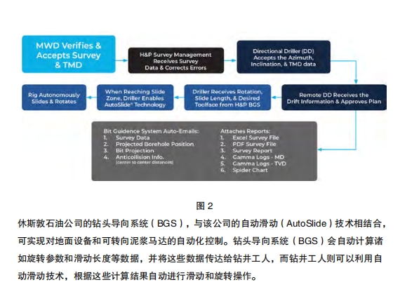 盡管在休斯敦石油公司優(yōu)化井筒定位的工作中,自動(dòng)化也占據(jù)著重要地位,但該公司認(rèn)識(shí)到,人的主觀判斷同樣不可忽視。福克斯先生指出,自動(dòng)化系統(tǒng)仍無(wú)法完全取代鉆井工人的直覺(jué)和洞察力。福克斯先生說(shuō):“歸根結(jié)底,沒(méi)有什么能替代經(jīng)驗(yàn)豐富的人對(duì)某些關(guān)鍵點(diǎn)的判斷,因?yàn)橐坏┪覀兣袛嗍д`,代價(jià)將極為高昂。在油井作業(yè)的不同階段,不同的技術(shù)需要人工進(jìn)行適度干預(yù),而在某些階段則需要更多的人為操作。我們?nèi)匀粺o(wú)法完全洞察井下的所有地質(zhì)情況,而這種不確定性依然難以克服。”該公司的鉆頭導(dǎo)向系統(tǒng)(BGS)旨在在井筒作業(yè)中實(shí)現(xiàn)人工洞察力與機(jī)器洞察力之間的平衡。BGS是一種認(rèn)知計(jì)算系統(tǒng),能夠針對(duì)傳統(tǒng)的彎式馬達(dá)定向鉆具組合做出導(dǎo)向決策。福克斯先生說(shuō):“鉆頭導(dǎo)向系統(tǒng)是邊緣計(jì)算與遠(yuǎn)程云計(jì)算的結(jié)合,以便做出最優(yōu)決策。它會(huì)進(jìn)行所有的數(shù)學(xué)運(yùn)算,并分析每一種不同的井筒軌跡,從而得出結(jié)論:實(shí)際上,從各方面來(lái)看,某一種井筒軌跡是最合理的。一旦達(dá)到特定深度,它就會(huì)指示你進(jìn)行滑動(dòng)操作,讓特定的工具面保持一定的英尺數(shù)。”該系統(tǒng)將隨鉆測(cè)量(MWD)供應(yīng)商獲取的定向測(cè)量數(shù)據(jù)錄入電子數(shù)據(jù)記錄儀(EDR),并生成一種數(shù)據(jù)傳輸流,可通過(guò)兩種方式之一將其傳送給鉆機(jī)。一種方式是在井場(chǎng)部署一臺(tái)計(jì)算機(jī)和通信設(shè)備,然后將其接入所需的WITS0數(shù)據(jù)傳輸流,并通過(guò)為休斯敦石油公司平板電腦設(shè)置的Wi-Fi網(wǎng)絡(luò)顯示輸出結(jié)果。另一種選擇是通過(guò)WITSML協(xié)議從電子數(shù)據(jù)記錄器供應(yīng)商處將數(shù)據(jù)傳輸至H&P遠(yuǎn)程指揮中心,信息在那里被輸入到一個(gè)專(zhuān)用集線器中。