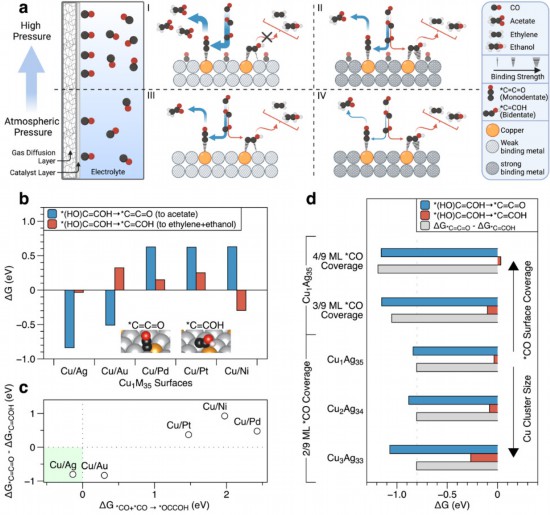 圖為該論文的理論計算,表明銅-銀稀釋合金催化劑表面更利于單齒型吸附的*C=C=O二碳基團的生成,及其需要更高的CO表面覆蓋度以保證碳-碳偶聯的高效發生。